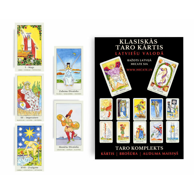Šīs Rider Waite Taro kārtis ir latviešu valodā ar brošūru, kurā ir detalizēti taro nozīmes skaidrojumi un kāršu izlikumu varianti.